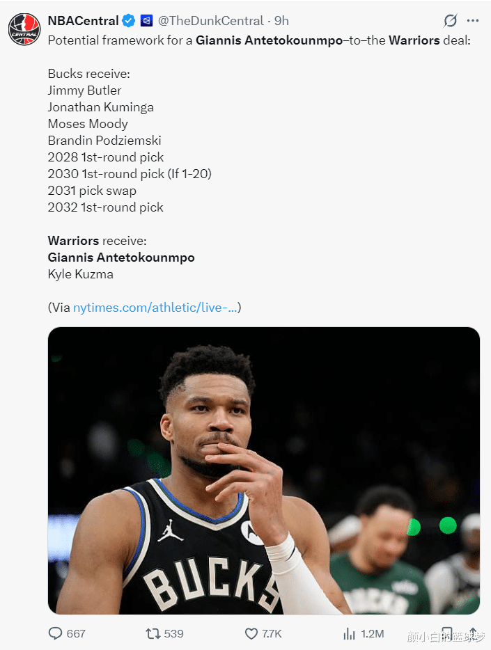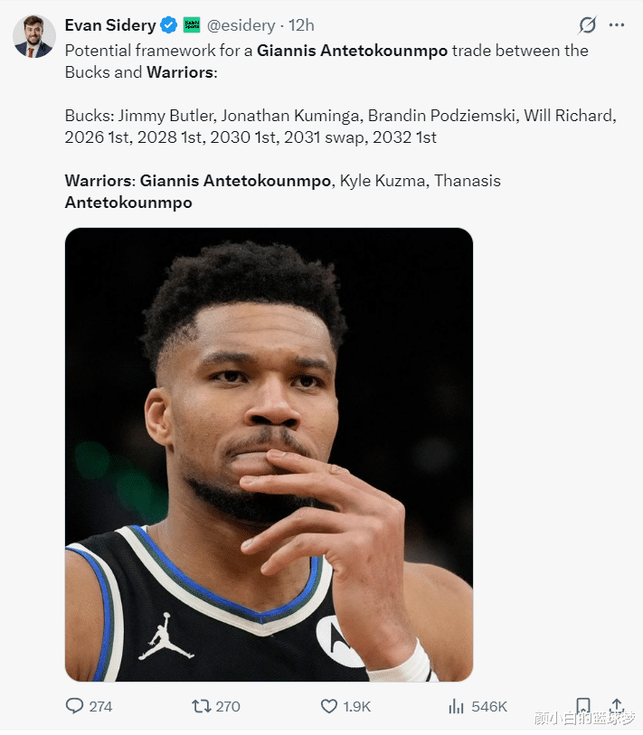 《福布斯体育》记者埃文-斯迪瑞透露,勇士队除了能送出4个首轮签外,他们2031年的首轮互换权也可以用于交易扬尼斯,而如今的难点在于如何配平薪资。